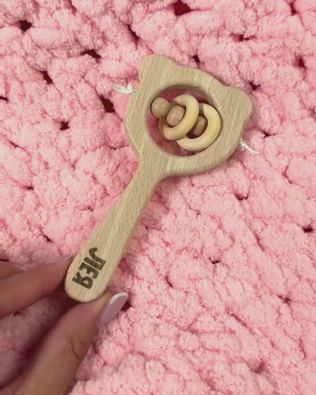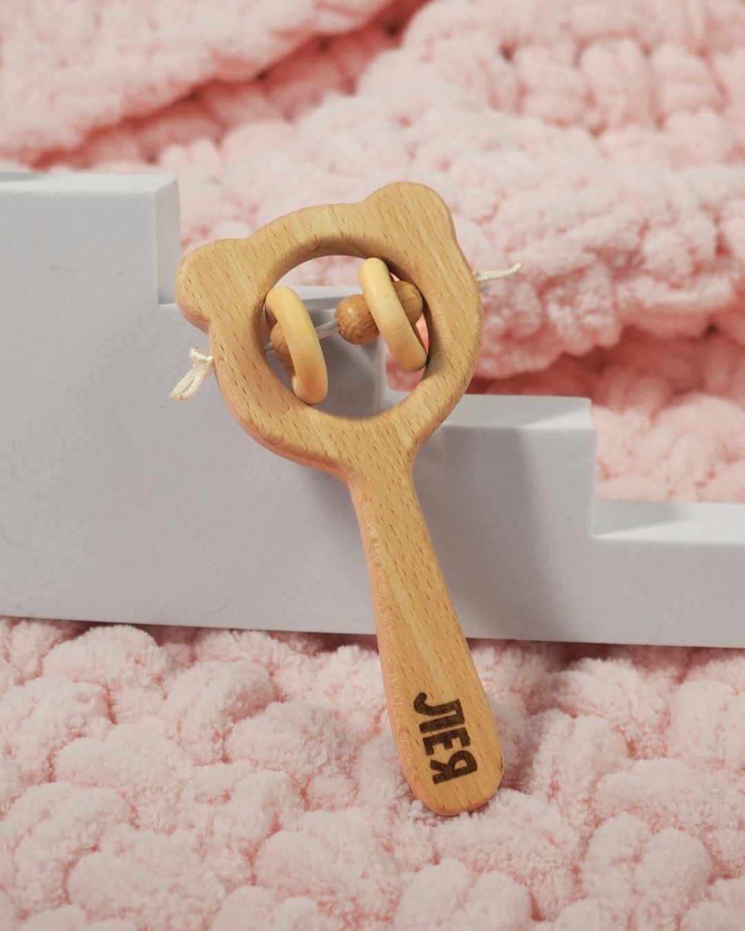 Легка та екологічна іграшка для перших відкриттів малюка. Натуральне дерево приємне на дотик, а гравіювання імені робить брязкальце унікальним.
